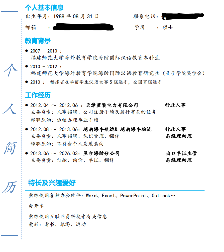 • 2007 - 2010 : 福建师范大学海外教育学院海防国际汉语教育本科生 • 2010 - 2012 : 福建师范大学海外教育学院海防国际汉语教育研究生(孔子学院奖学金) • 2010 : 福建省在华留学生汉语大赛 5 强选手,全国百强选手 工作经历 • 2012.04 ~ 2012.06 :天津蓝巢电力有限公司 行政人事 主要负责:人事招聘、公司注册手续及履行有关的任务 辞职原油:返校办理毕业手续 • 2012.08 ~ 2013.06:越南海丰航运& 越南海丰物流 行政人事 主要负责:人事招聘、认识管理、翻译 总经理助理 辞职原油:不符合个人发展意向 • 2013.06 ~ 2026.03:昱台海防分公司 出口单证主管 主要负责:订舱、询价、单证、翻译 总经理助理 |