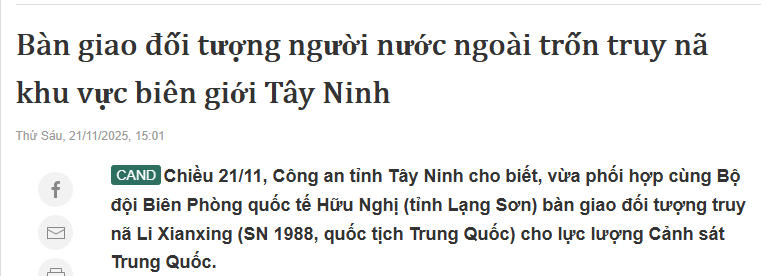 据越南媒体cand报道,越南西宁省公安厅11月21日下午消息称,该厅已协同越南友谊国际口岸边防支队(位于谅山省),将通缉对象李贤兴(音译自越南媒体,1988年出生,中国国籍; Li Xianxing,SN 1988, quốc tịch Trung Quốc)移交给中国警方。