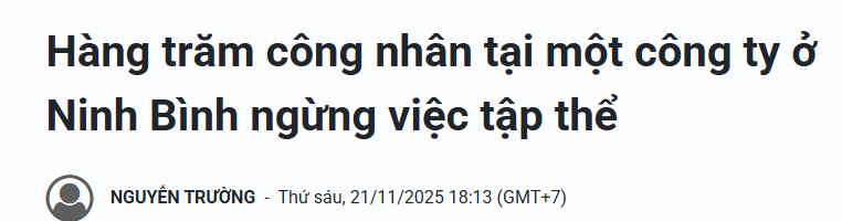 据越南媒体laodong报道,11月21日14时30分许,位于越南宁平省中山坊庆上工业区的Global Tone有限公司(Công ty TNHH Global Tone,thuộc Cụm công nghiệp Khánh Thượng, phường Trung Sơn, tỉnh Ninh Bình)近300名工人集体停工,并聚集在公司院内。